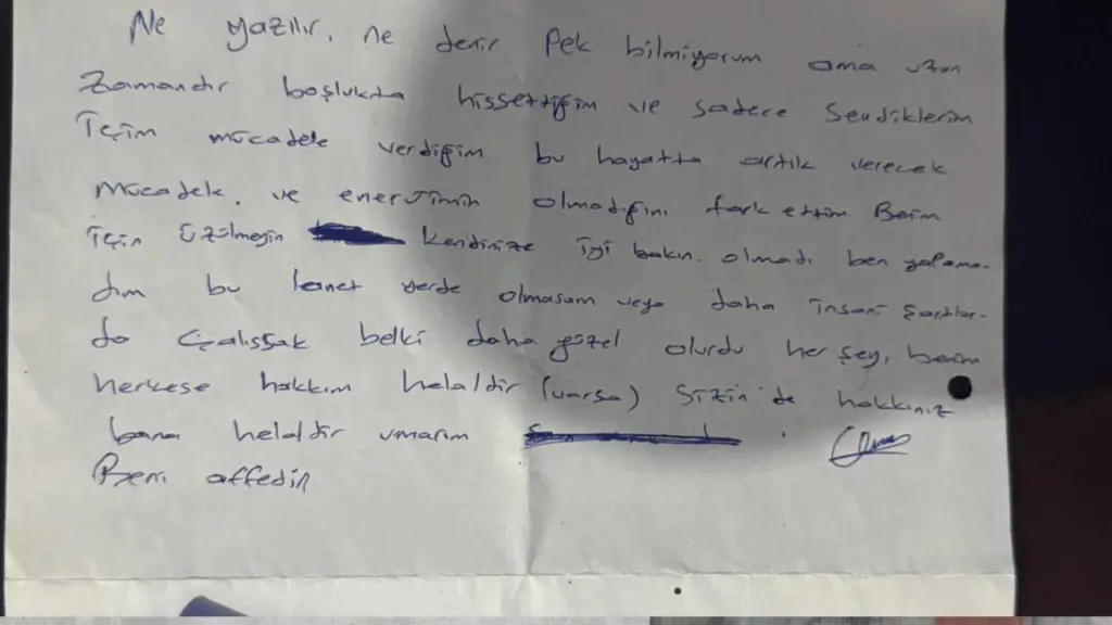 “Ne yazılır, ne denir pek bilmiyorum ama uzun zamandır boşlukta hissettiğim ve sadece sevdiklerim için mücadele verdiğim bu hayatta artık verecek mücadele, ne enerjim ne umudum kalmadı. Benim için üzülmesin kimse, kendinize iyi bakın. Olmadı, ben yapamadım bu lanet yerde olmamam için daha insanca şartlarda çalışsak belki daha güzel olurdu. Herkese hakkım helaldir (varsa). Sizler de hakkınızı bana helal edin, umarım beni affedin.”
