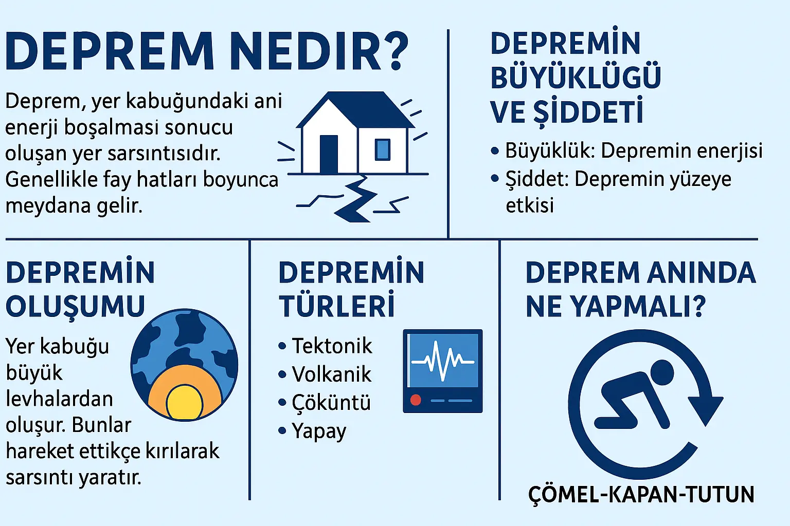 Deprem, yer kabuğundaki kırıklar boyunca ani enerji boşalması sonucu oluşan yer sarsıntısıdır. Bu enerji boşalması, dalgalar halinde yayılarak yeryüzünde hissedilir. Depremler genellikle fay hatları üzerinde meydana gelir. Bu fay hatları, yer kabuğundaki levhaların birbirine sürtündüğü, sıkıştığı veya ayrıldığı bölgelerde bulunur.